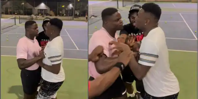 UK-based Ghanaian boxer Freezy Macbones clashed with former Ghanaian footballer, Asamoah Gyan after a tennis training game....