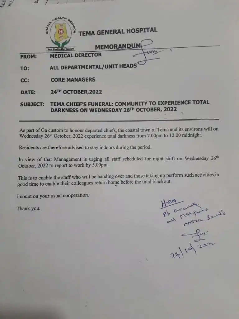 Aspart of Ga custom to honour departed chiefs, the coastal towns of Tema and its environs will on Wednesday 26th October 2022 experience total darkness from 7 pm to 12 midnight.
