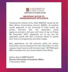 In the university’s press release, it made it clear that following the release of the 2022 WASSCE results, all awaiting results applicants to the University of Cape Coast are hereby informed that the application portal is still open. The portal is expected go be closed on Friday, 9th December, 2022.