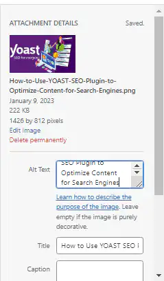 When you upload your compressed image, i.e., the feature image and any other images for content. Do well to name the image with the keyword phrase and use the same as or the title of the post that contains the keyword phrase as the name of the image and the Alt Text. This further improves the SEO score in Yoast.