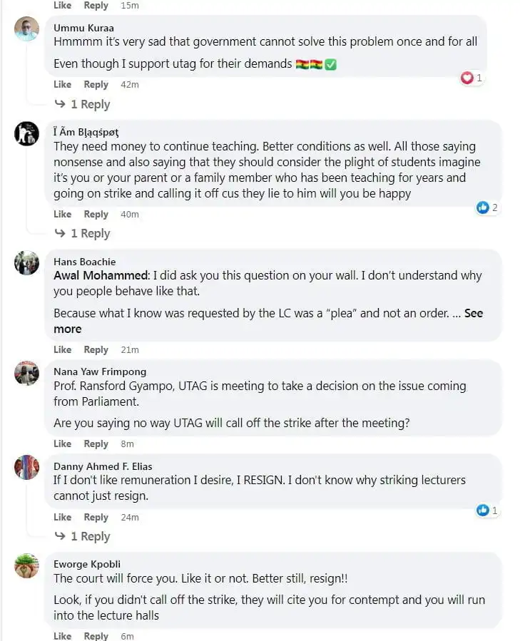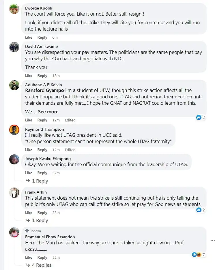 A Starrfm.com.gh news item republished by Ghanaeducation.org indicated the strike had been called off however, Prof. Ransford Gyampo posted a COUNTER REACTION regarding the news that UTAG has called off the Strike on his official Facebook page. He said:
