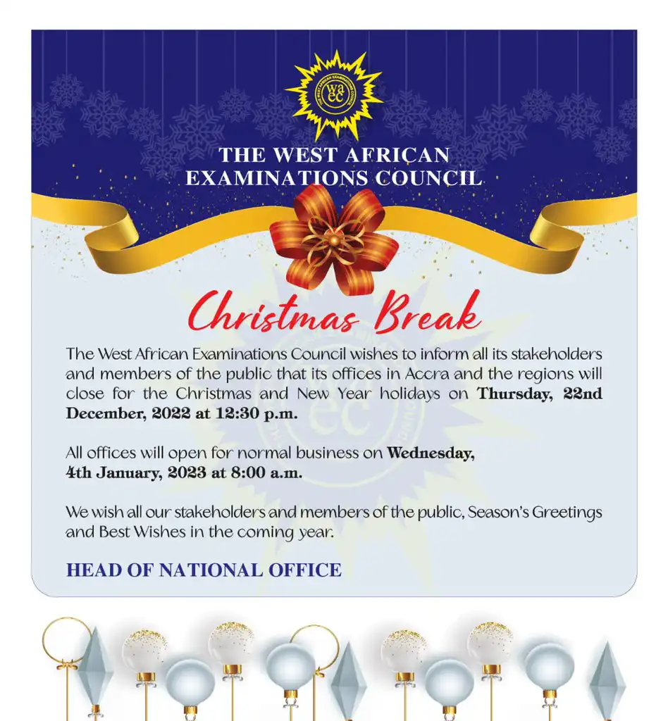 The West African Examination Council wishes to inform all its stakeholders and members of the public that its offices in Accra and the regions will close for the Christmas and New Year holidays on Thursday, 22nd December 2022 at 12:30 pm.