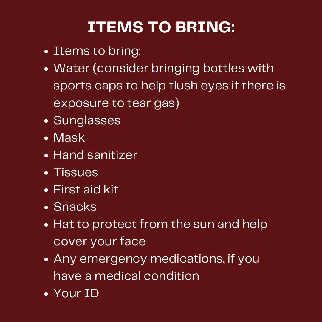 - Sports caps to help flush eyes if there is exposure to tear gas